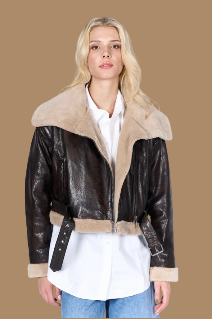 Real leather aviator jacket with fur collar in a flattering cropped cut. Versatile enough for any occasion and built to last, developing rich character with wear. The perfect investment piece that delivers both style and substance.